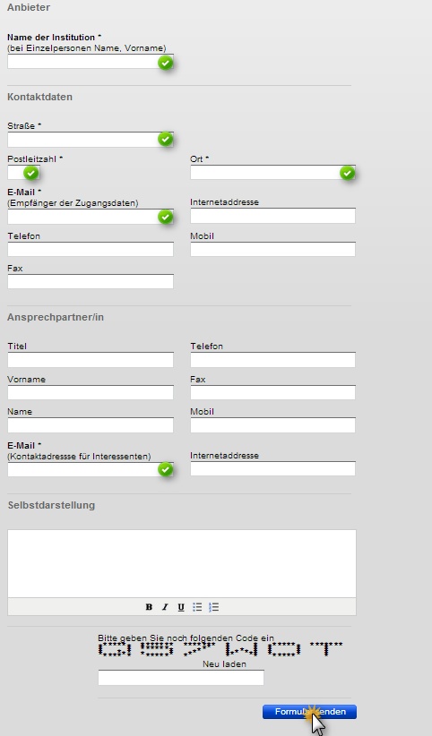 Drücken Sie nach dem Ausfüllen - Eingabe des Sicherheitscodes nicht vergessen - die Schaltfläche unterhalb des Formulars. Beachten Sie das alle mit * gekennzeichneten Felder Pflichtfelder sind und ausgefüllt werden müssen, damit Ihre Registrierung erfolgreich ist.