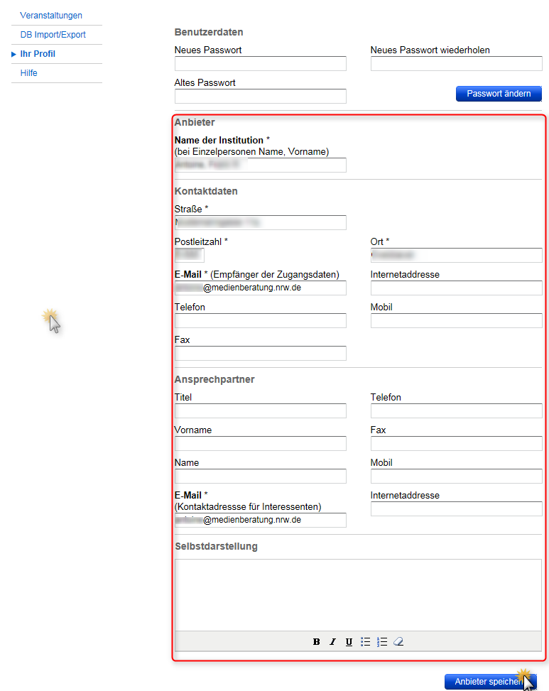 Füllen Sie die entsprechenden Felder aus und drücken Sie dann bitte die Schaltfläche "Anbieter speichern"!