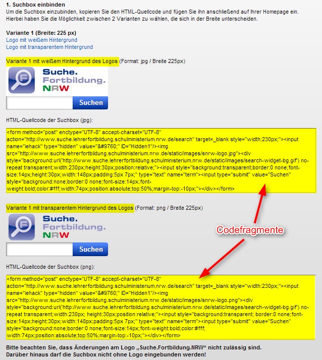 Um die Suchfunktionalität verfügbar zu mache,n wählen Sie "Suchbox einbinden". Wollen Sie hingegen nur mit dem Logo werben, klicken Sie auf "Logo "Suche.Fortbildung.NRW "einbinden". Bitte beachten Sie die gegebenen Hinweise zur Nutzung.