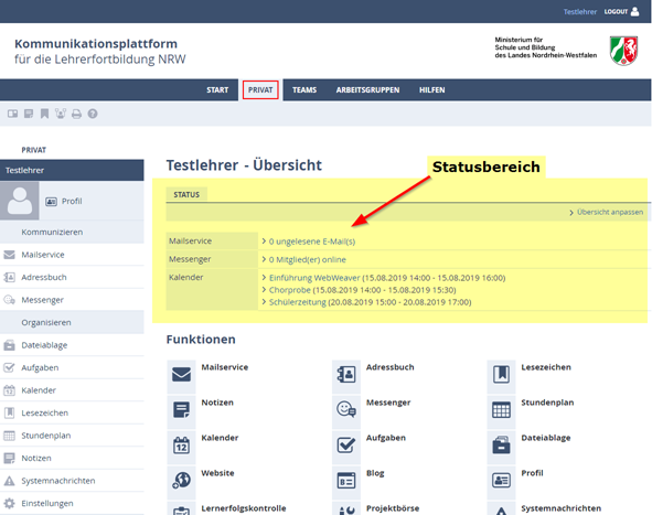 Nach der Anmeldung auf der Kommunikationsplattform starten Sie in Ihrem persönlichen Bereich (Privat) des Online-Bereichs. Dieser ist nur für Sie erreichbar und sichtbar. Die Dateiablage und Ihr Mailpostfach sind nur für Sie einsehbar.