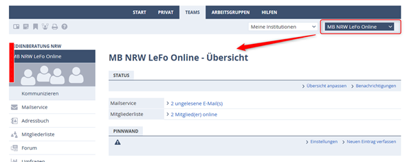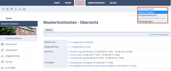 Die Arbeitsbereiche Ihrer Gruppen erreichen Sie bequem über das Pull-down-Menü in der rechten oberen Ecke des Arbeitsbereichs "Teams".Das Pull-down-Menü „Ihre Gruppen“ bietet Zugriff auf die Gruppen, in denen Sie Mitglied sind. Wenn Sie in eine Gruppe aufgenommen werden wollen, wenden Sie sich an die Moderierenden der Gruppen. Diese können Sie zu einer Gruppe hinzufügen oder Sie aus einer Gruppe entfernen.