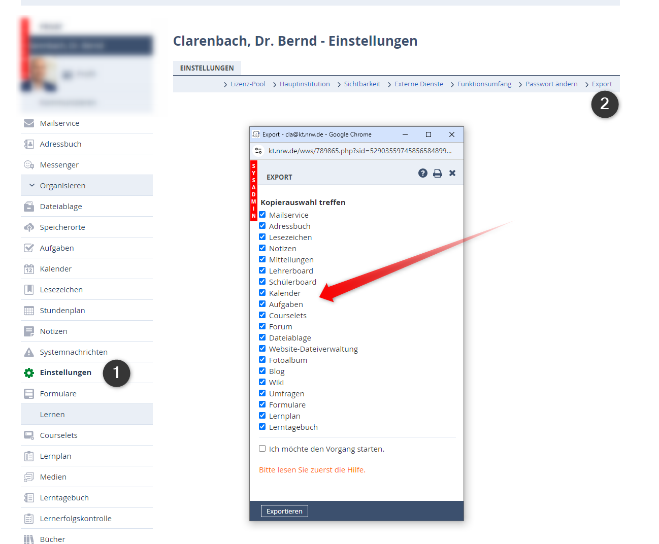 Im Privatbereich finden Sie außerdem unter "Einstellungen" den Link "Export", über den Sie Ihre privaten Funktionsinhalte sichern und als tar-Archiv herunterladen können.